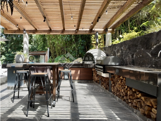 La casa ha sido recientemente remodelada, combinando detalles rústicos y modernos que le dan un aire fresco y acogedor. Cuenta con 5 habitaciones, área de TV, y una amplia terraza perfecta para disfrutar del ambiente boscoso. El área de asador y el jacuzzi invitan al descanso y la convivencia al aire libre.